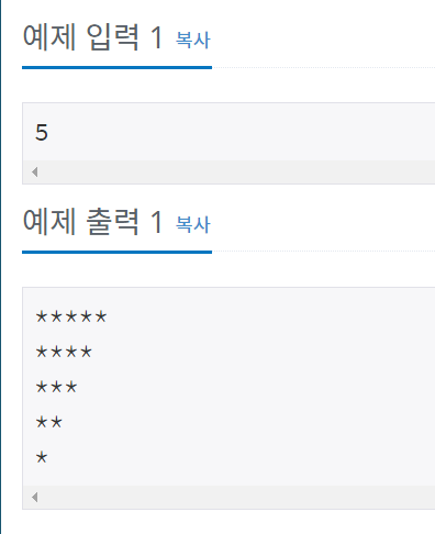 첫째 줄에는 별 N개, 둘째 줄에는 별 N-1개, ..., N번째 줄에는 별 1개를 찍는 문제
