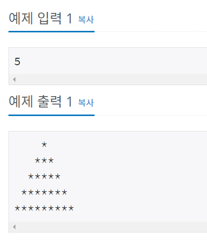 첫째 줄에는 별 1개, 둘째 줄에는 별 3개, ..., N번째 줄에는 별 2×N-1개를 찍는 문제 별은 가운데를 기준으로 대칭이어야 한다.