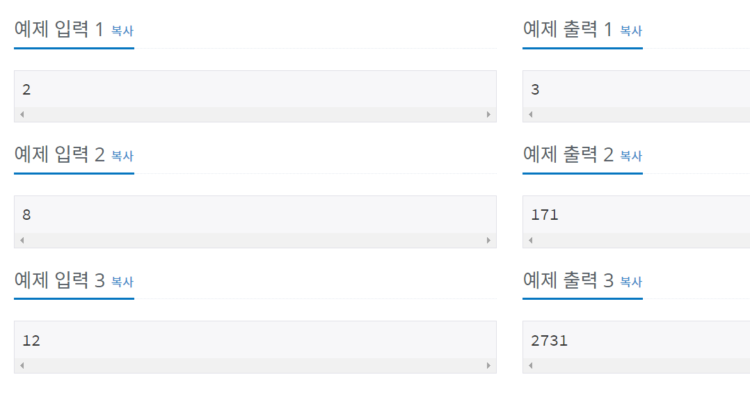 N이 2일 때는 2 X 2이므로 총 세 가지의 방법이 존재합니다.