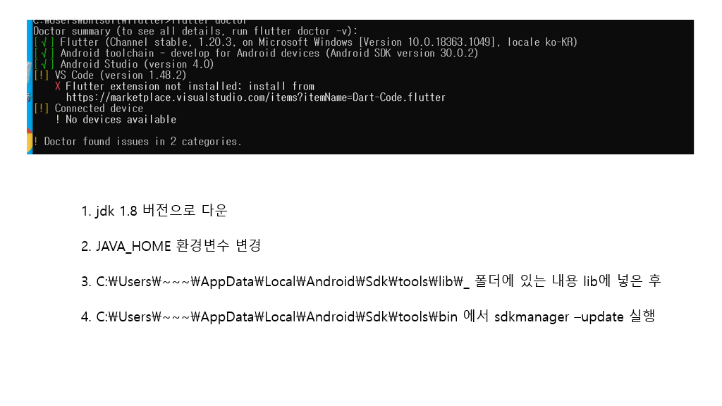 cmd에 flutter doctor를 실행하면 android SDK가 없다는 경고가 떴다.