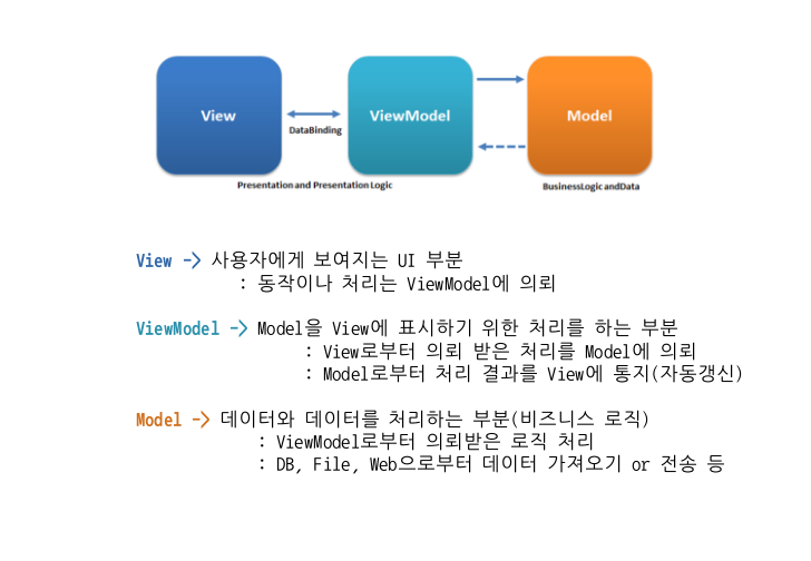 ... .. .Command를 통하여 Behavior를 View의 특정한 ViewAction(Event)와 연결할 수 있으며, ViewModel의 속성과 특정 View의 속성을 Binding 시켜 줌으로써 ViewModel 속성이 변경 될때마다 View를 업데이트 시켜줄 수 있음 |