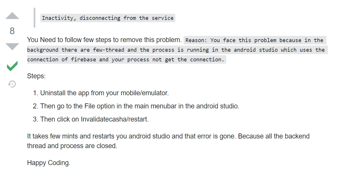 I face this problem in two android projects . In one i was trying to retrieve data from Firebase into Recyclerview and in onother i was trying to login using phone number but in both cases logcat is