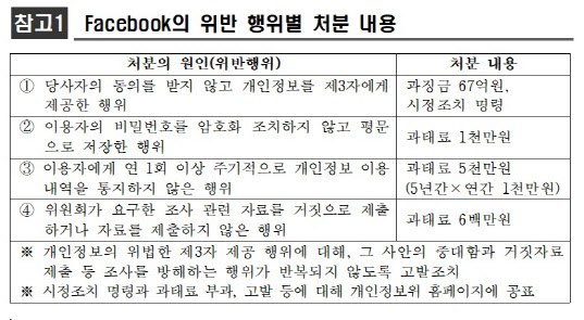 개인정보위는 당사자 동의를 받지 않고 제3자에게 개인정보를 제공한 행위를 중대한 위반행위로 보고 페이스북에 67억원의 과징금 부과와 함께 시정조치를 명령하고 수사기관에 고발하기로 했다. 또 △이용자의 비밀번호를 암호화하지 않고 저장한 행위 △이용자에게 주기적으로 이용내역을 통지하지 않은 행위 △거짓자료 제출 등 행위에 대해서도 총 6600만원의 과태료를 부과했다.