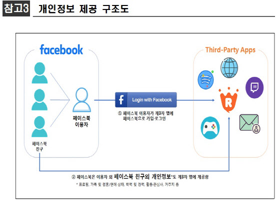 개인정보위는 조사 결과 페이스북이 당사자 동의를 받지 않고 다른 사업자에게 개인 정보를 제공한 사실을 확인했다. 이용자가 페이스북 로그인을 통해 다른 사업자의 서비스를 이용할 때 본인 정보와 함께 `페이스북 친구`의 개인정보가 동의 없이 다른 사업자에게 제공됐으며, `페이스북 친구`는 본인의 개인정보가 제공된 사실조차 모르는 상태인 것으로 확인됐다.