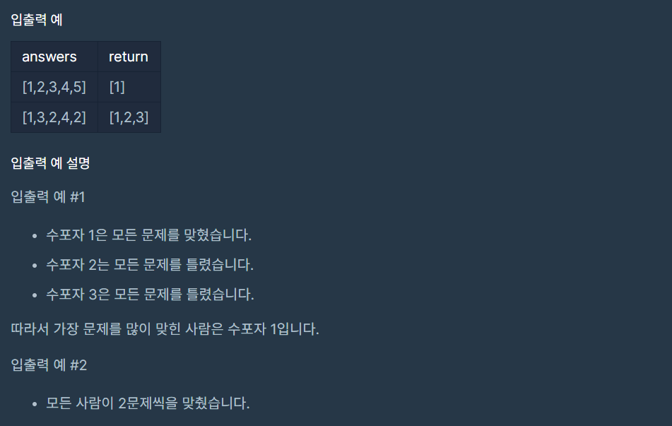 ✔ 맞춘 문제를 ++하면서, 가장 큰 정답의 개수를 확인합니다. 그 후 가장 많이 맞춘 사람을 return해줍니다.(오름차순으로)