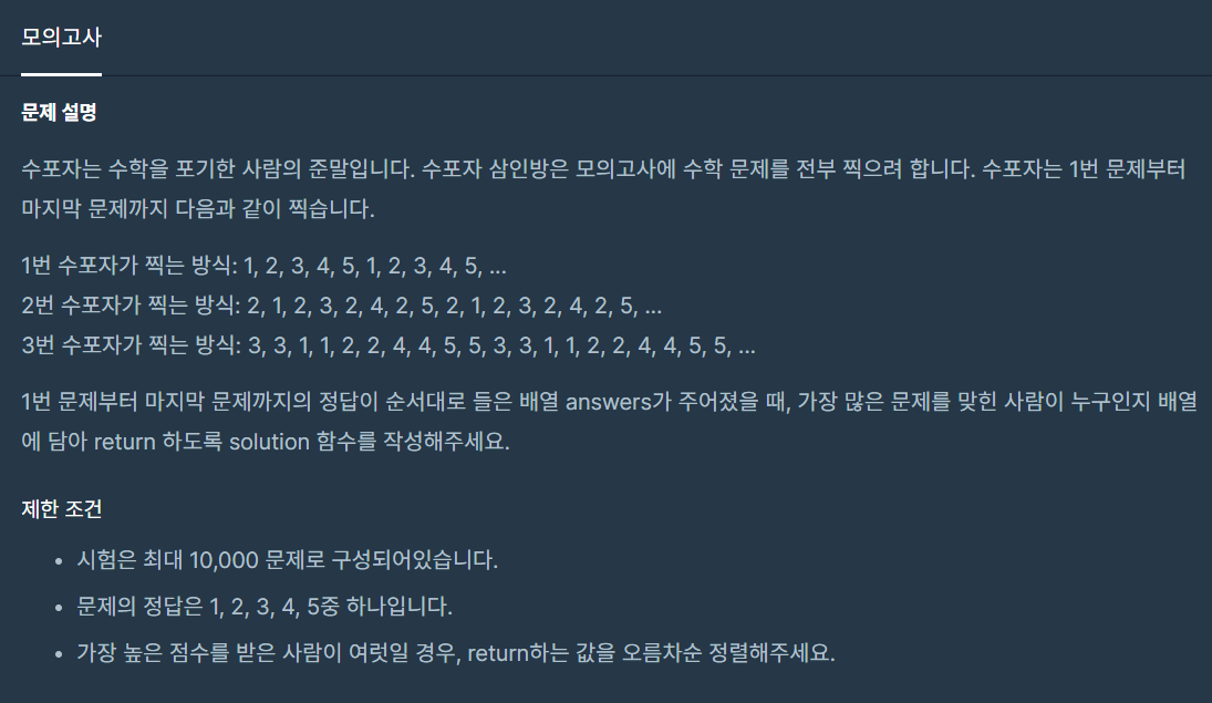 > 2번 수포자는 3, 3, 1, 1, 2, 2, 4, 4, 5, 5로 반복하여 문제를 찍습니다.