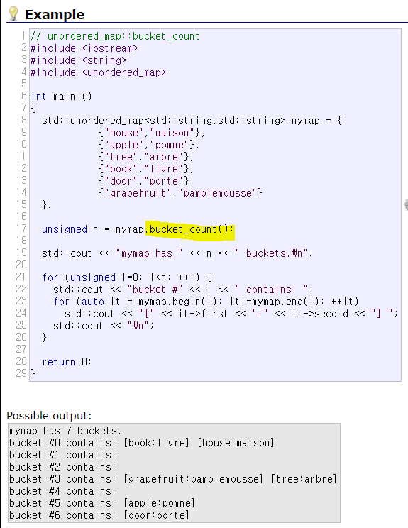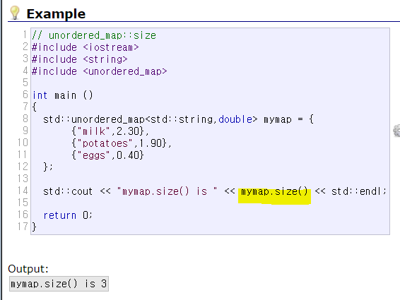 | Element access | at | 지정된 키 값이 있는 요소에 접근합니다. | example = { {"Mars" 3000} , {"Jupiter", 7000} }; example.at( "Mars" ) = 25; > example 내의 Mars의 value는 25로 바뀝니다. |