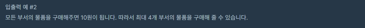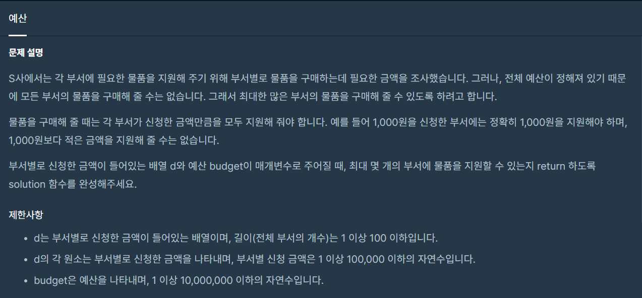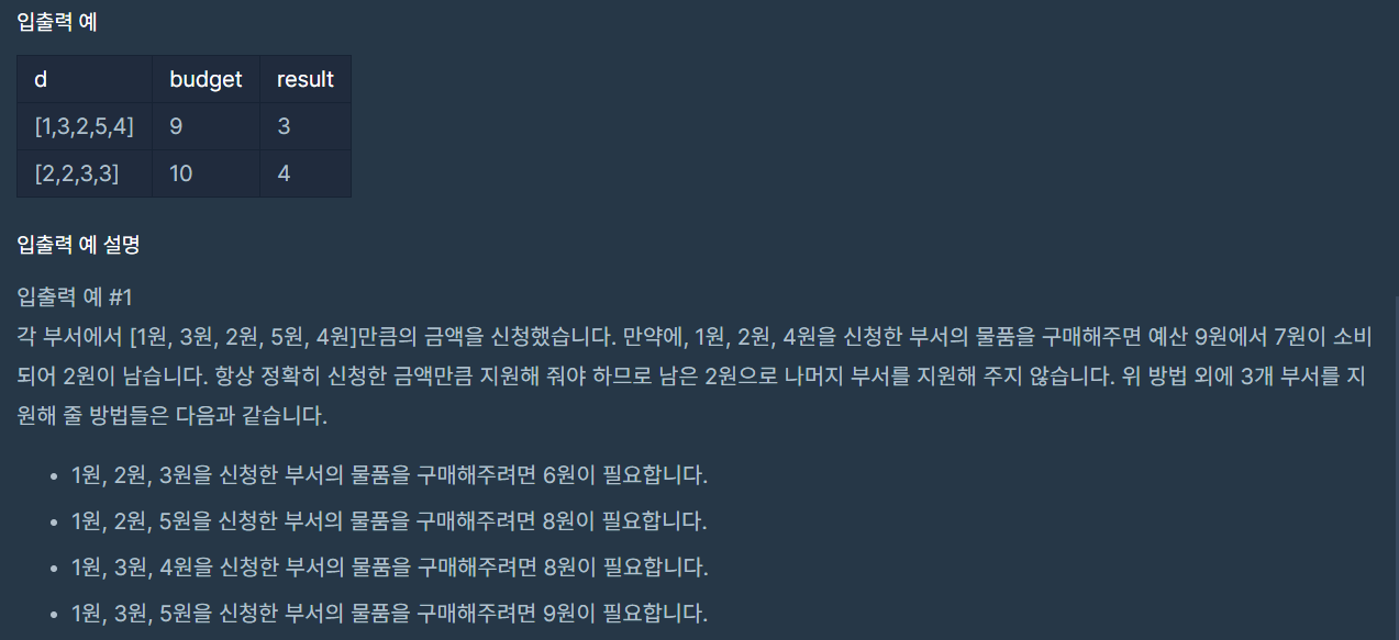 S사에서는 각 부서에 필요한 물품을 지원해 주기 위해 부서별로 물품을 구매하는데 필요한 금액을 조사했습니다. 그러나, 전체 예산이 정해져 있기 때문에 모든 부서의 물품을 구매해 줄 수는