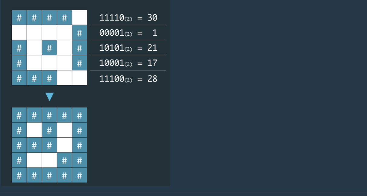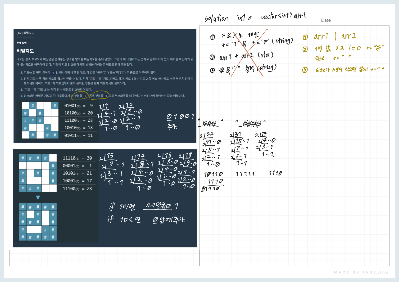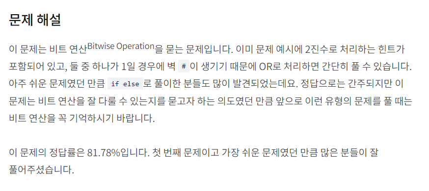 하나하나 이진수로 변환해주는 방법이나 bitset을 사용한 후 "#"과 " "으로 변환해보았으나 코드가 비효율적이었습니다.