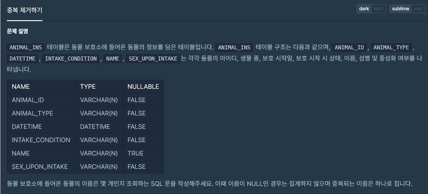 ANIMAL_INS 테이블은 동물 보호소에 들어온 동물의 정보를 담은 테이블입니다. ANIMAL_INS 테이블 구조는 다음과 같으며, ANIMAL_ID, ANIMAL_TYPE, DATETIME, INTAKE_CONDITION, NAME, SEX_UPON_INTAKE는 각각 동물의 아이디