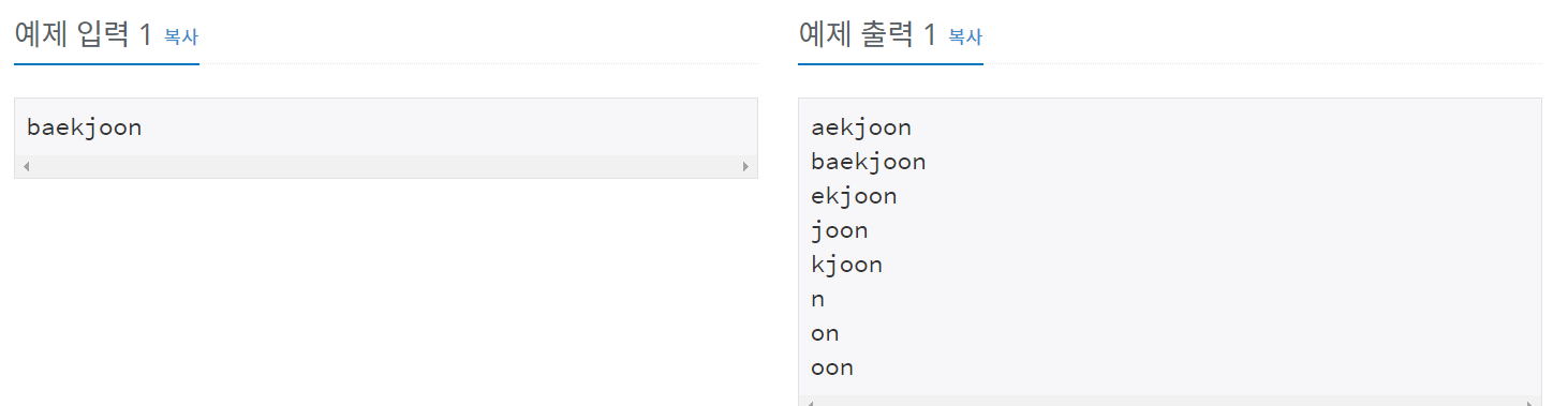 baekjoon의 접미사는 baekjoon, aekjoon, ekjoon, kjoon, joon, oon, on, n 으로 총 8가지가 있고, 이를 사전순으로 정렬하면, aekjoon, baekjoon, ekjoon, joon, kjoon, n, on, oon이 된다.