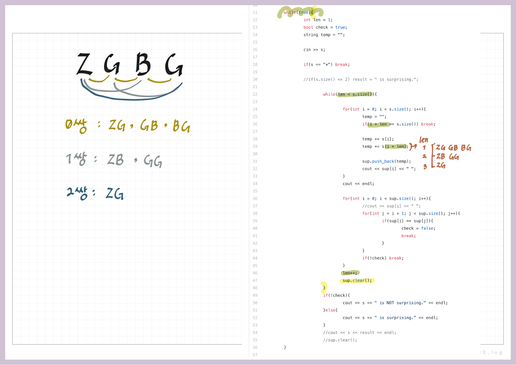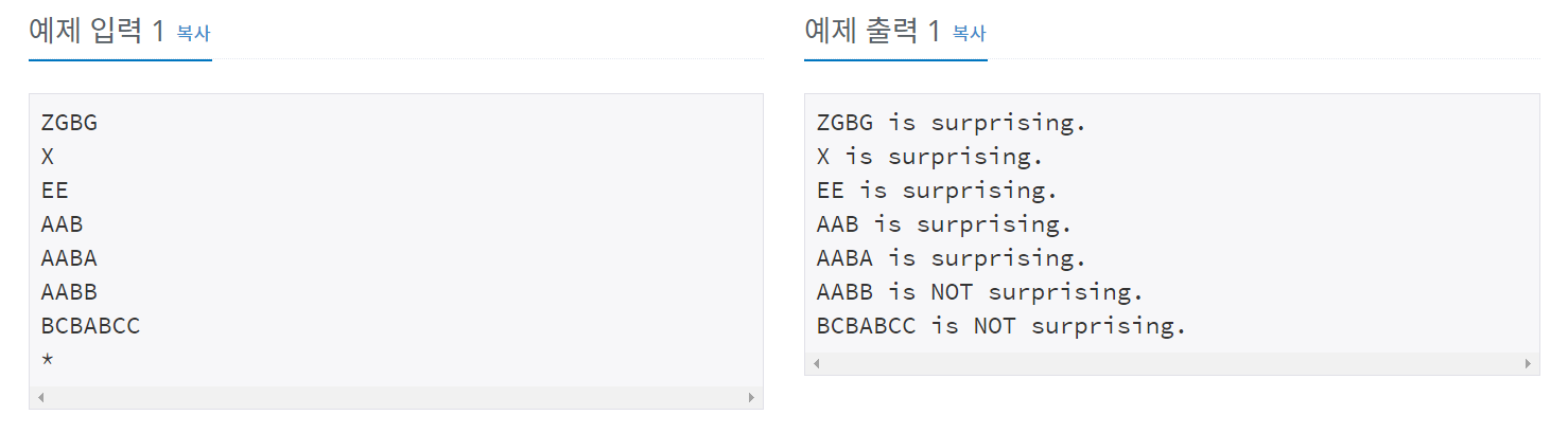 각 줄에 이 문자열이 놀라운(surprising) 문자열인지 아닌지를 아래의 예제와 같이 출력한다.