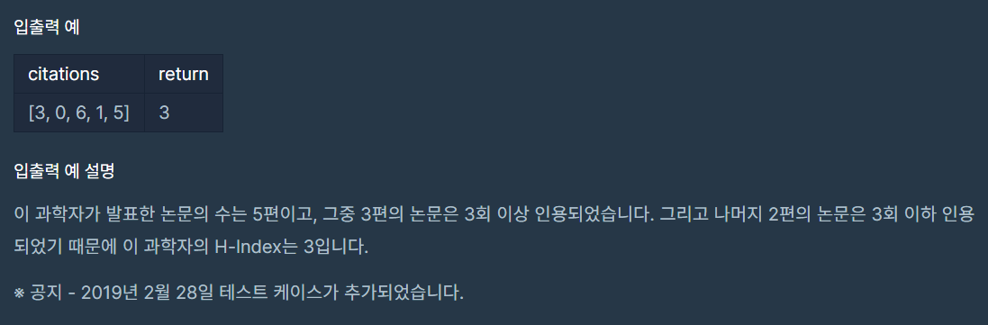 H-Index는 과학자의 생산성과 영향력을 나타내는 지표입니다. 어느 과학자의 H-Index를 나타내는 값인 h를 구하려고 합니다. 위키백과1에 따르면, H-Index는 다음과 같이 구합니다. 어떤 과학자가 발표