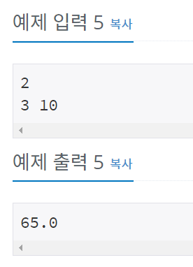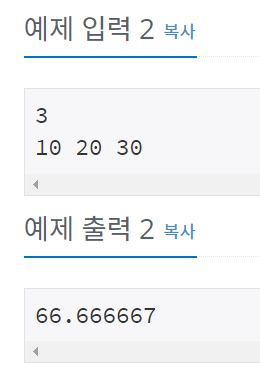 첫째 줄에 새로운 평균을 출력한다. 실제 정답과 출력값의 절대오차 또는 상대오차가 10-2 이하이면 정답이다.
