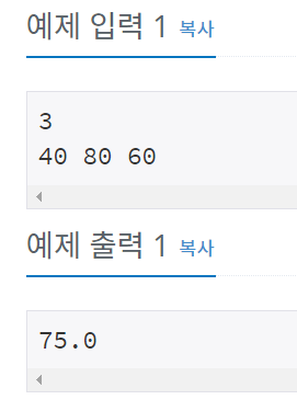 세준이는 기말고사를 망쳤다. 세준이는 점수를 조작해서 집에 가져가기로 했다. 일단 세준이는 자기 점수 중에 최댓값을 골랐다. 이 값을 M이라고 한다. 그리고 나서 모든 점수를 점수/M*100으로 고쳤다.