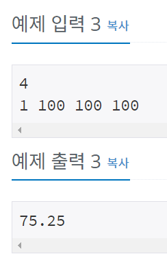 첫째 줄에 새로운 평균을 출력한다. 실제 정답과 출력값의 절대오차 또는 상대오차가 10-2 이하이면 정답이다.