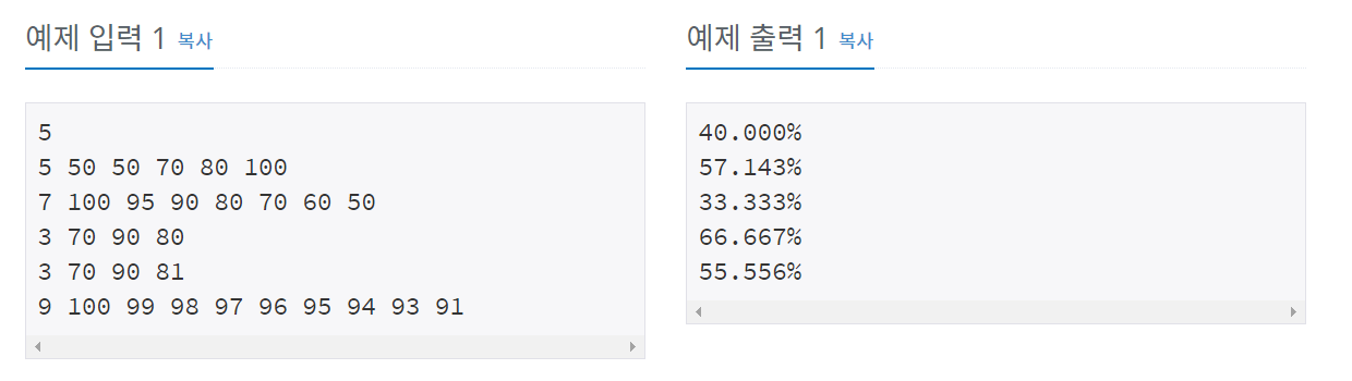 각 케이스마다 한 줄씩 평균을 넘는 학생들의 비율을 반올림하여 소수점 셋째 자리까지 출력한다.