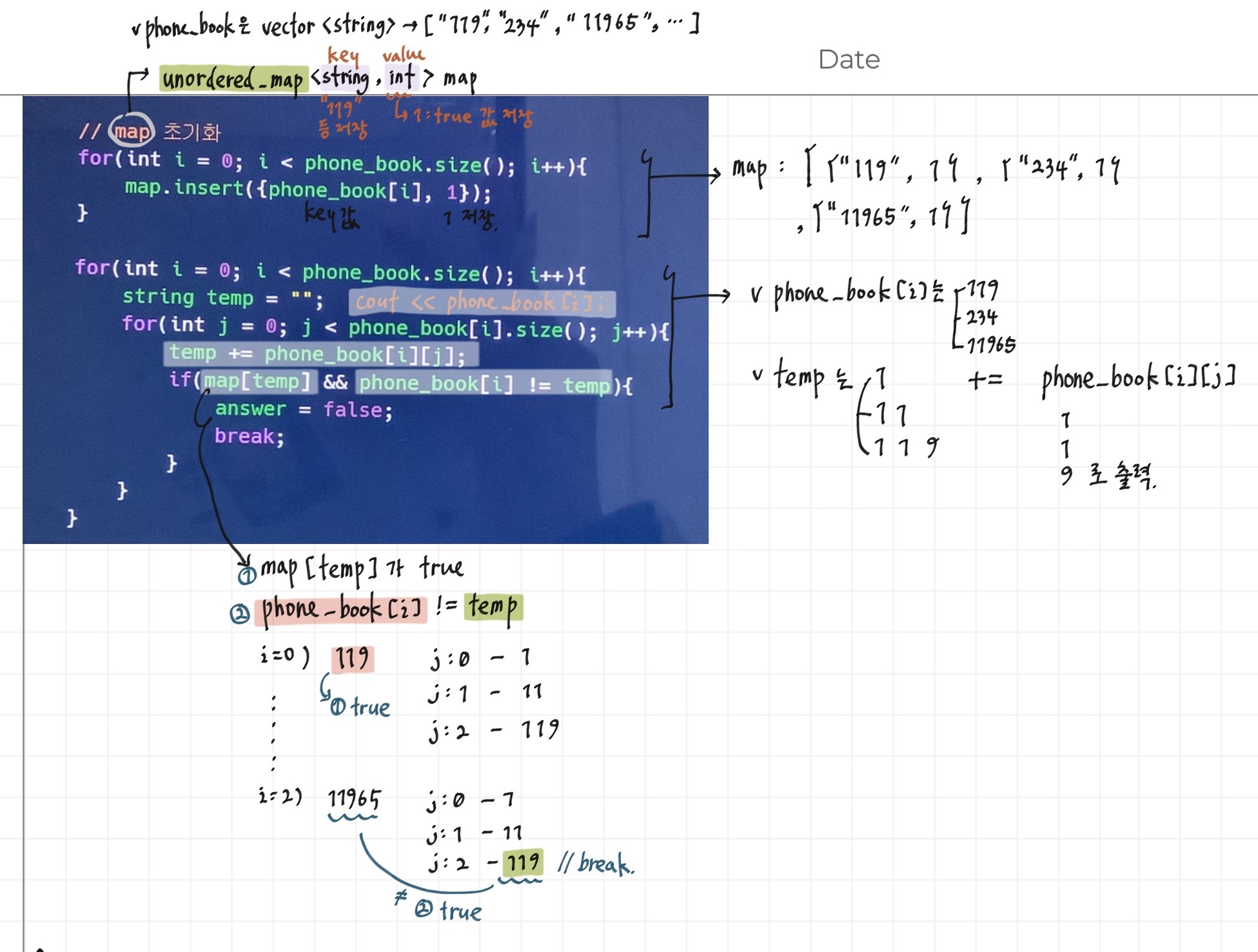 // phone_book[i]가 119일 때, map[temp]가 true가 된다. -> 틀린 답이 출력됨.