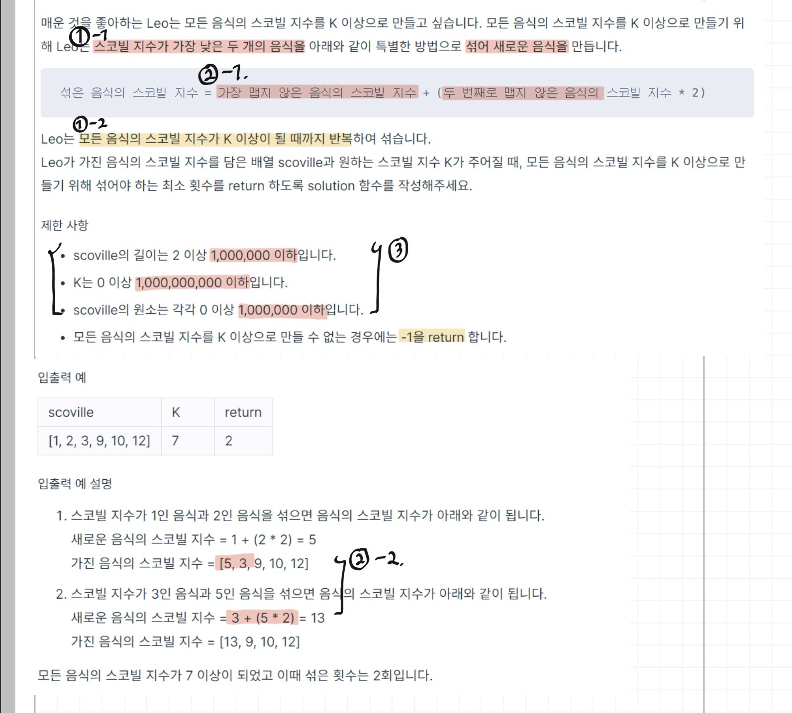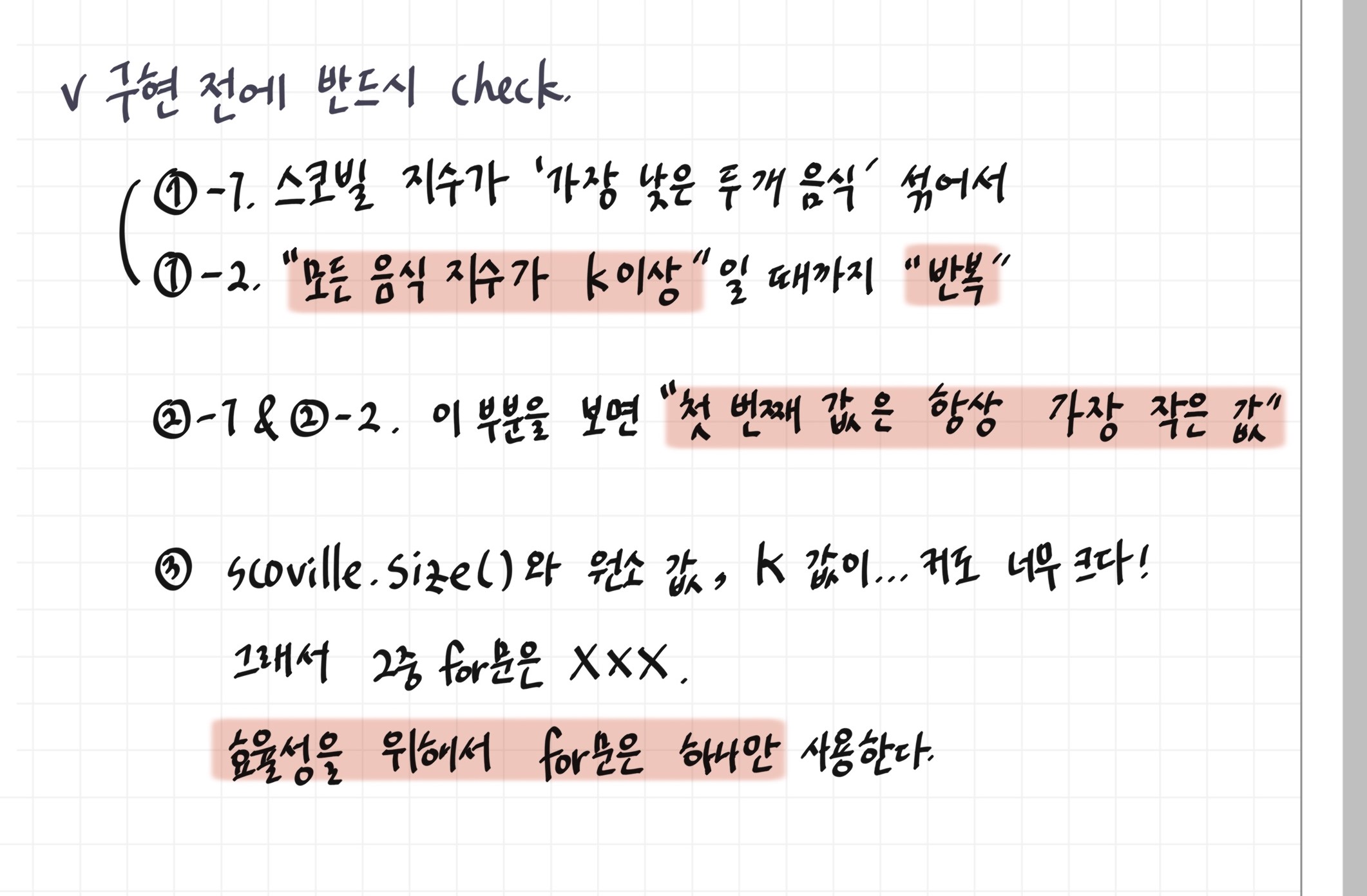 ✔ 스코빌 지수를 구할 때, 첫 번째 값은 항상 작은 값이어야 합니다. 따라서 priority_queue를 min heap으로 구현합니다.