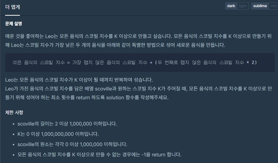 그리고 첫 번째 값, 두 번째 값으로 계산한 새로운 스코빌 지수를 priority_queue에 push합니다.