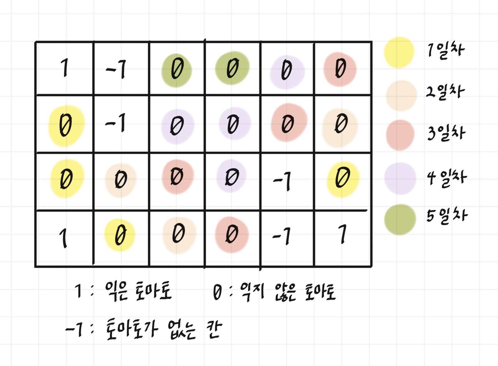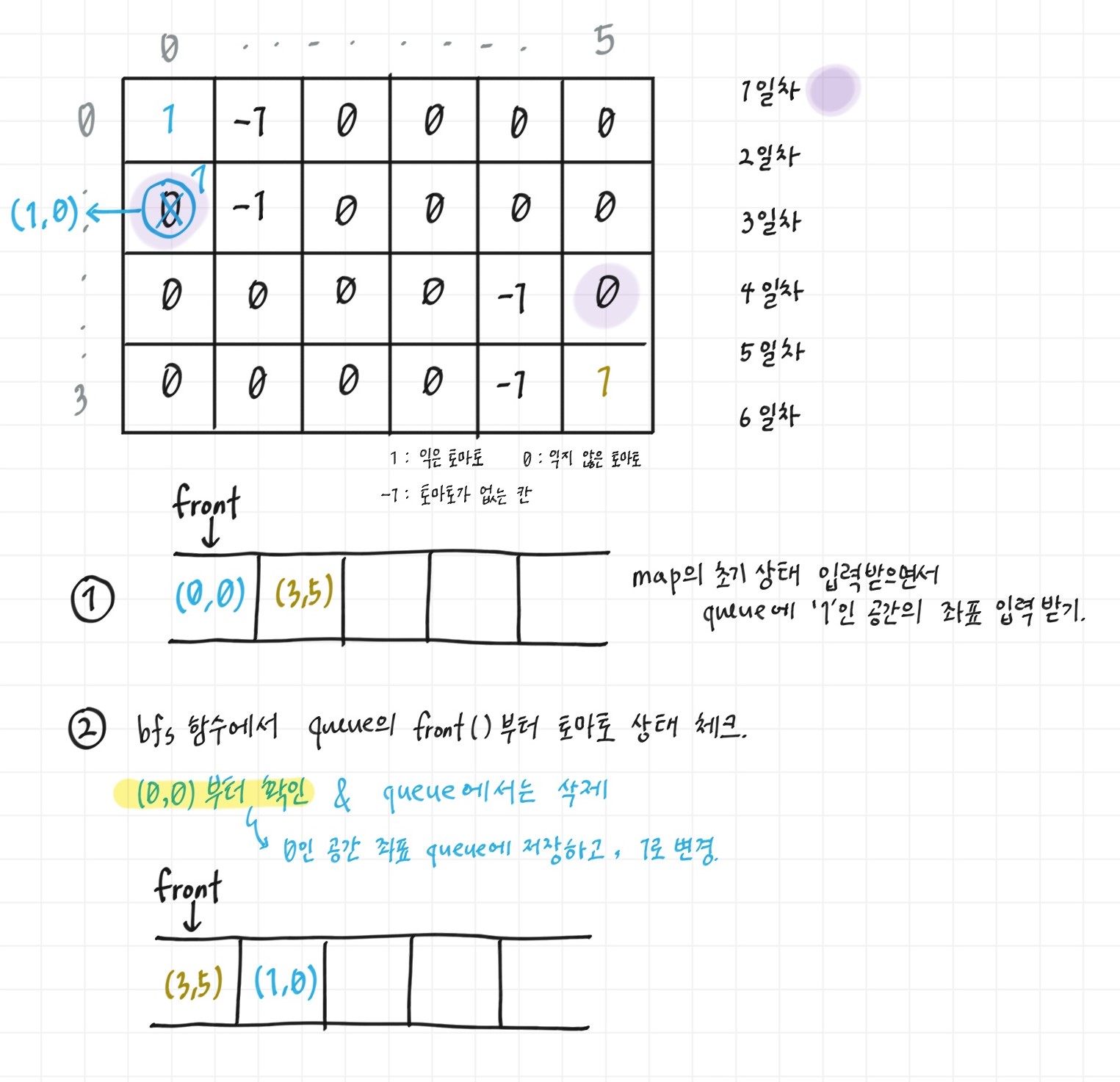 1. 토마토가 익은 점들을 큐에 넣어준다. (동시 다발적으로 일어나기 때문에 큐를 사용한 BFS) |