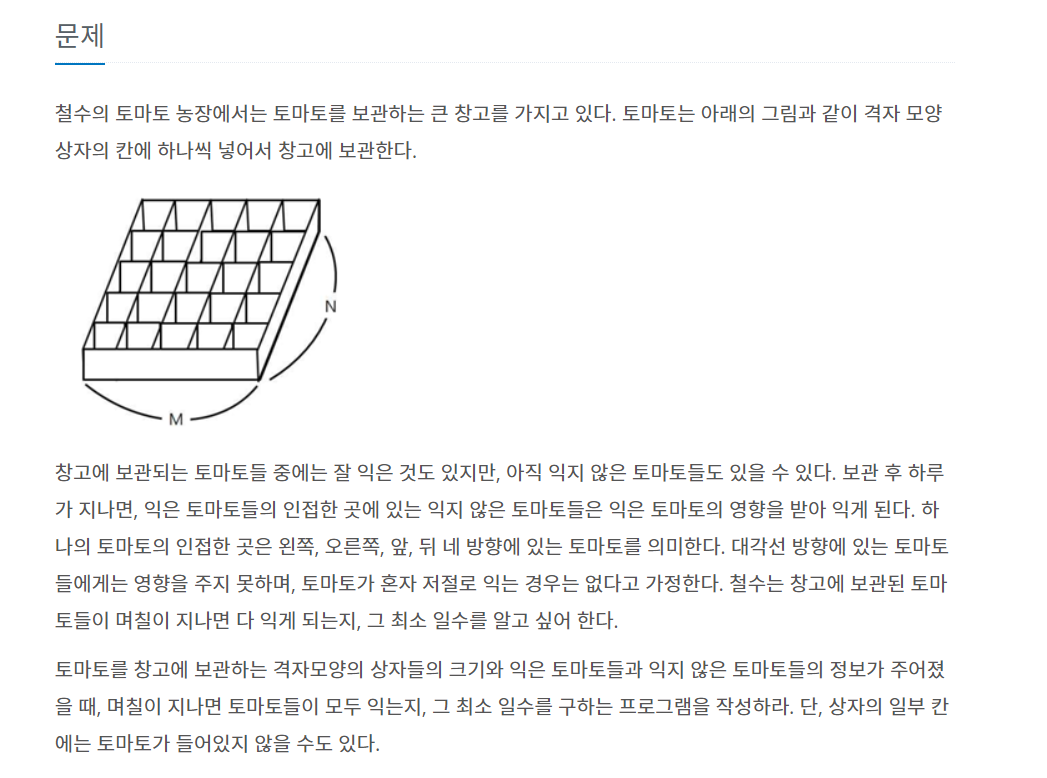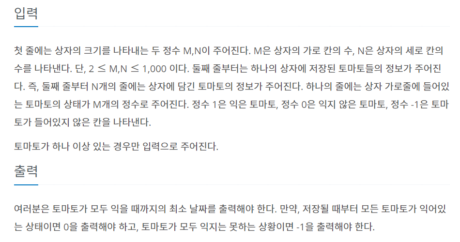 첫 줄에는 상자의 크기를 나타내는 두 정수 M,N이 주어진다. M은 상자의 가로 칸의 수, N은 상자의 세로 칸의 수를 나타낸다. 단, 2 ≤ M,N ≤ 1,000 이다. 둘째 줄부터는 하나의 상자에 저장된 토마토