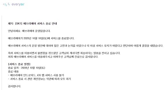 14일 SK텔레콤은 에브리에어 이용 고객들에게 메일을 통해 서비스 종료를 공지했다. 에브리에어 안드로이드, iOS 앱 서비스 사용이 불가하며, 서비스 종료 시 관련 개인정보는 약관에 따라 모두 파기된다고 알렸다.