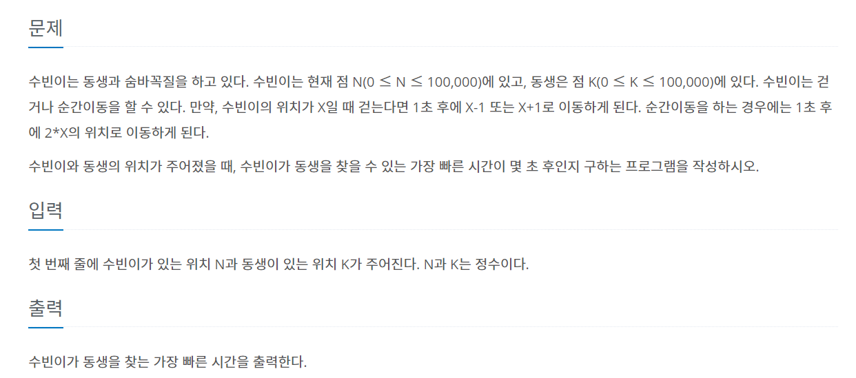 수빈이는 동생과 숨바꼭질을 하고 있다. 수빈이는 현재 점 N(0 ≤ N ≤ 100,000)에 있고, 동생은 점 K(0 ≤ K ≤ 100,000)에 있다. 수빈이는 걷거나 순간이동을 할 수 있다. 만약, 수빈이의 위치가 X일