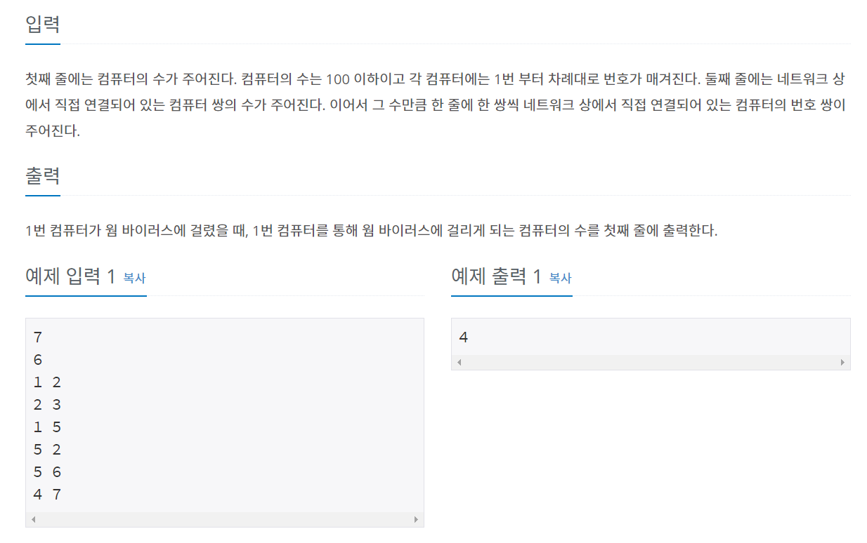 첫째 줄에는 컴퓨터의 수가 주어진다. 컴퓨터의 수는 100 이하이고 각 컴퓨터에는 1번 부터 차례대로 번호가 매겨진다. 둘째 줄에는 네트워크 상에서 직접 연결되어 있는 컴퓨터 쌍의 수가 주어