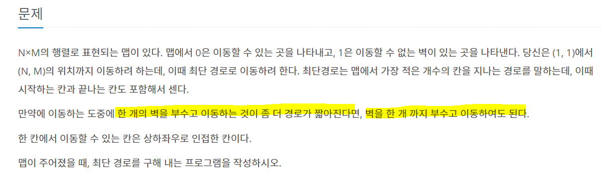 알고리즘 분류 : BFS BFS를 통해 최단 거리를 구할 수 있는 문제다. 미로 탐색에서 약간 변형된 문제이며, 벽을 최대 1개만 부셔서 이동할 수 있다. 벽을 부수지 않거나(0), 벽을 1개 부시는(1) 경우