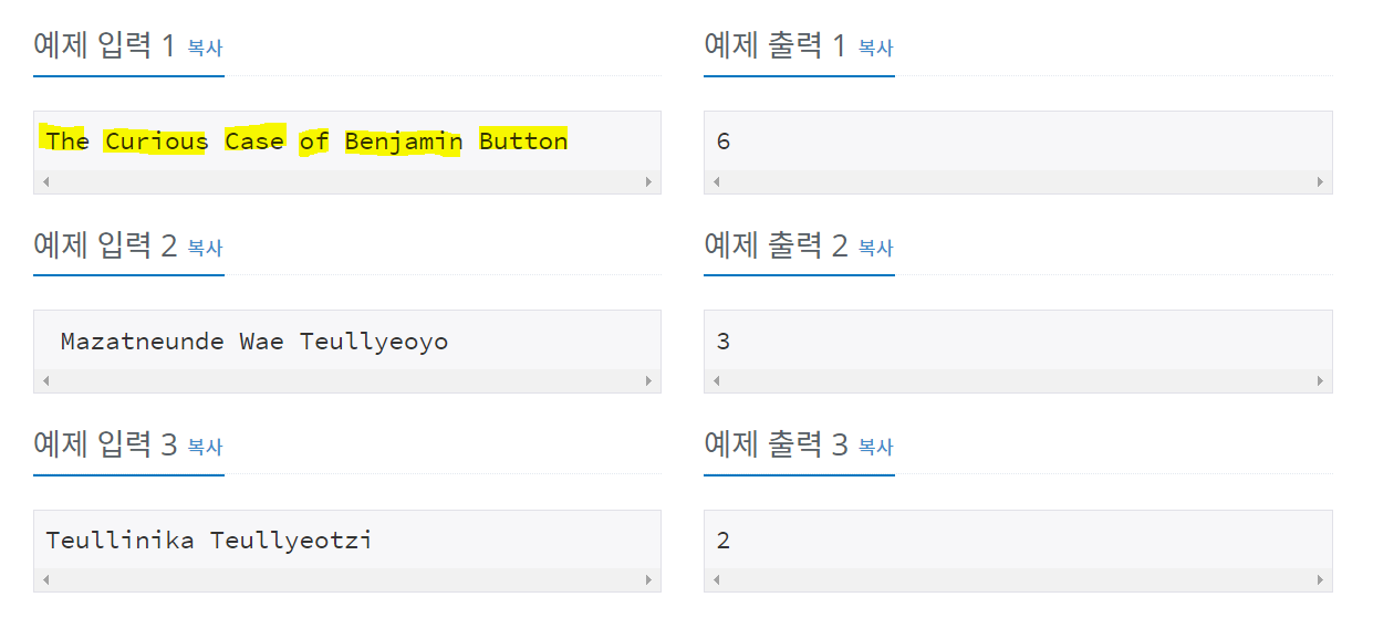 첫 줄에 영어 대소문자와 띄어쓰기로 이루어진 문자열이 주어진다. 이 문자열의 길이는 1,000,000을 넘지 않는다. 단어는 띄어쓰기 한 개로 구분되며, 공백이 연속해서 나오는 경우는 없다. 또한