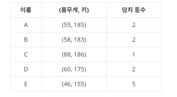 N명의 집단에서 각 사람의 덩치 등수는 자신보다 더 "큰 덩치"의 사람의 수로 정해진다. 만일 자신보다 더 큰 덩치의 사람이 k명이라면 그 사람의 덩치 등수는 k+1이 된다. 이렇게 등수를 결정하면 같은 덩치 등수를 가진 사람은 여러 명도 가능하다. 아래는 5명으로 이루어진 집단에서 각 사람의 덩치와 그 등수가 표시된 표이다.