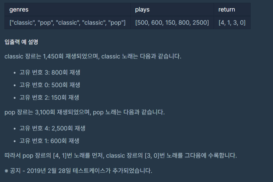 - 장르 내에서 재생 횟수가 같은 노래 중에서는 고유 번호가 낮은 노래를 먼저 수록합니다.