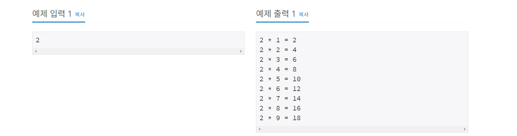 N을 입력받은 뒤, 구구단 N단을 출력하는 프로그램을 작성하시오. 출력 형식에 맞춰서 출력하면 된다.